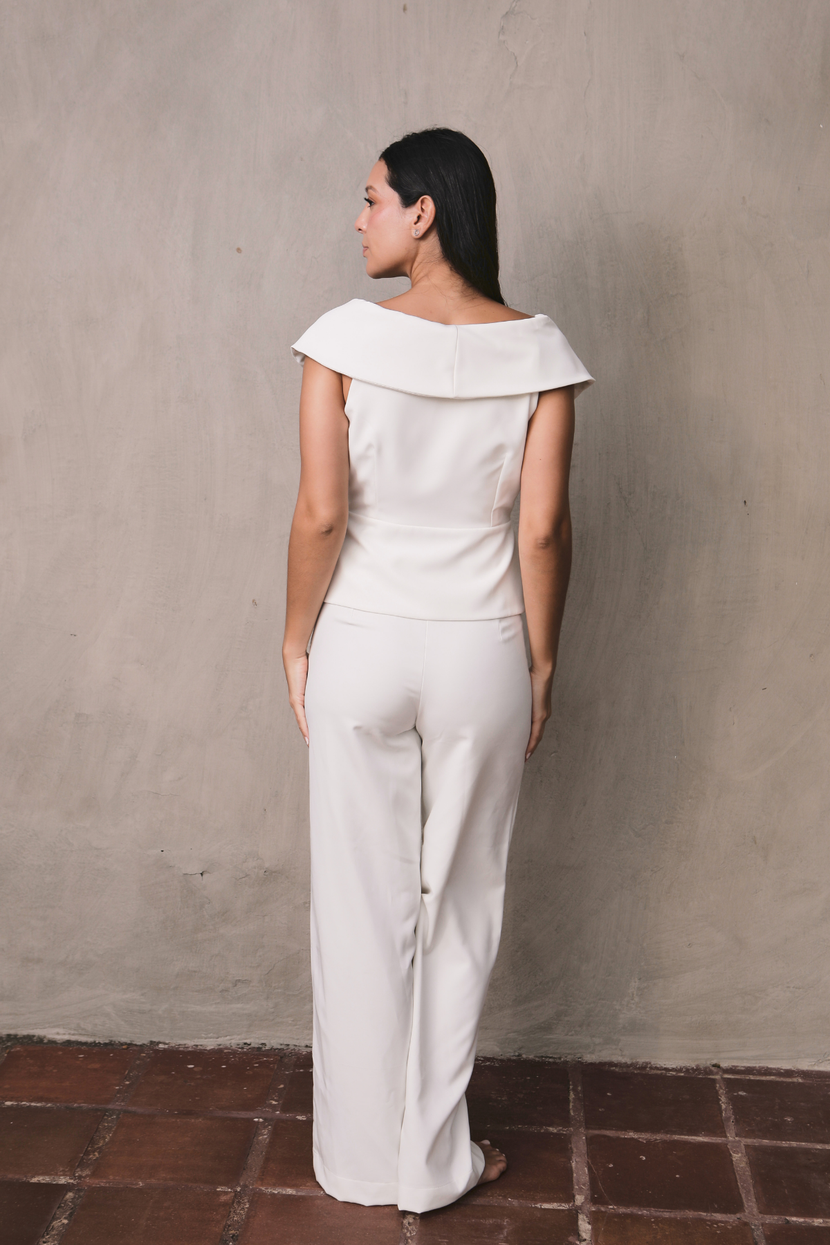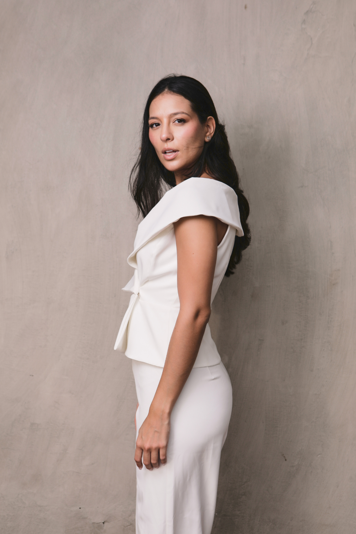 Blusa con escote amplio asimetrico, que enmarca los hombros y aporta un aire sofisticado. Su silueta estructurada resalta la figura con un equilibrio entre elegancia y minimalismo. Confeccionada en crepé, ofrece una textura suave y caída refinada, ideal para ocasiones especiales o looks de noche. Ideal para llevar en set con el Marisa Pant.