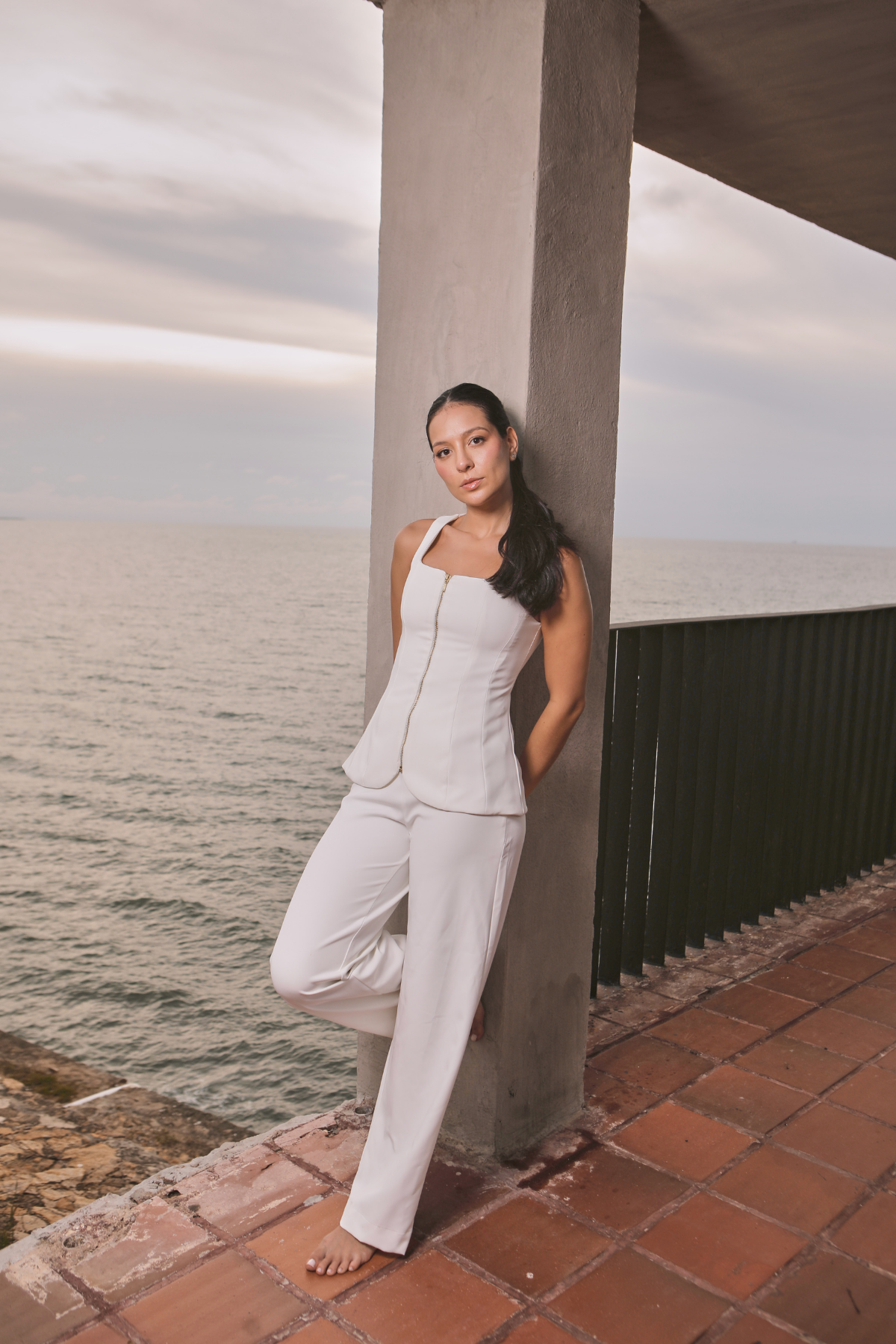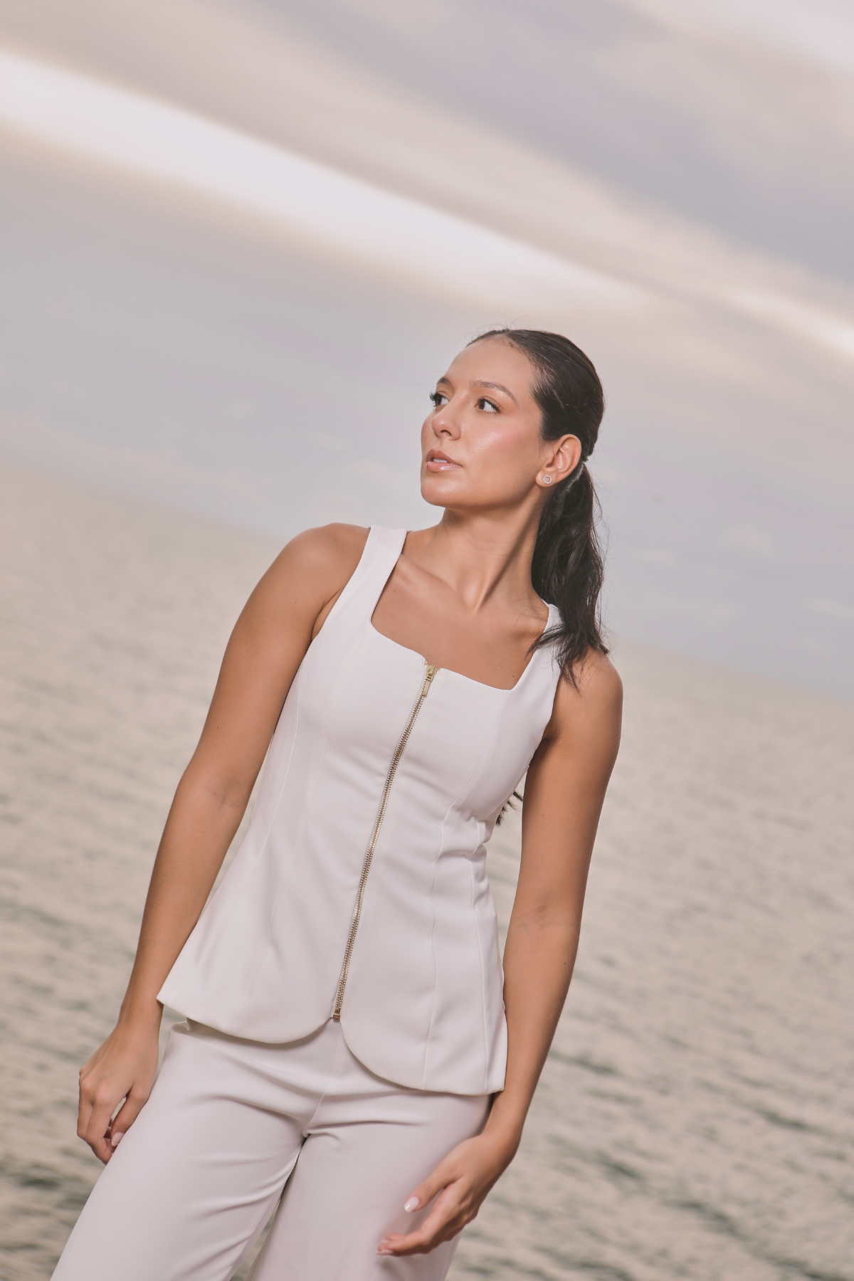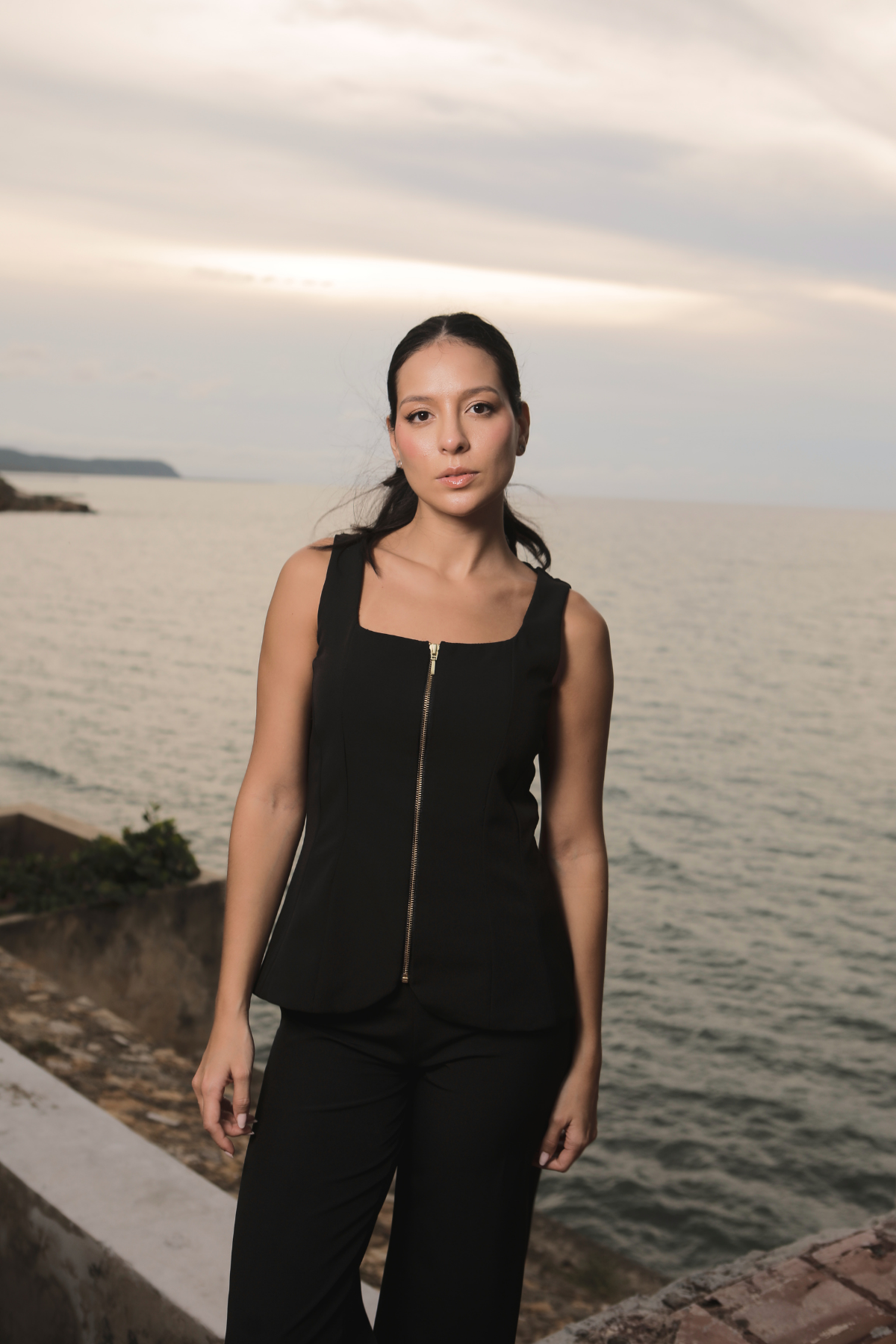 Blusa con escote recto y corredera frontal metálica, de silueta entallada que estiliza la figura. Confeccionada en crepé, ofrece una caída ligera y un acabado sofisticado. La espalda presenta un diseño limpio con cortes que moldean suavemente la silueta. Ideal para llevar en set con el Marisa Pant.