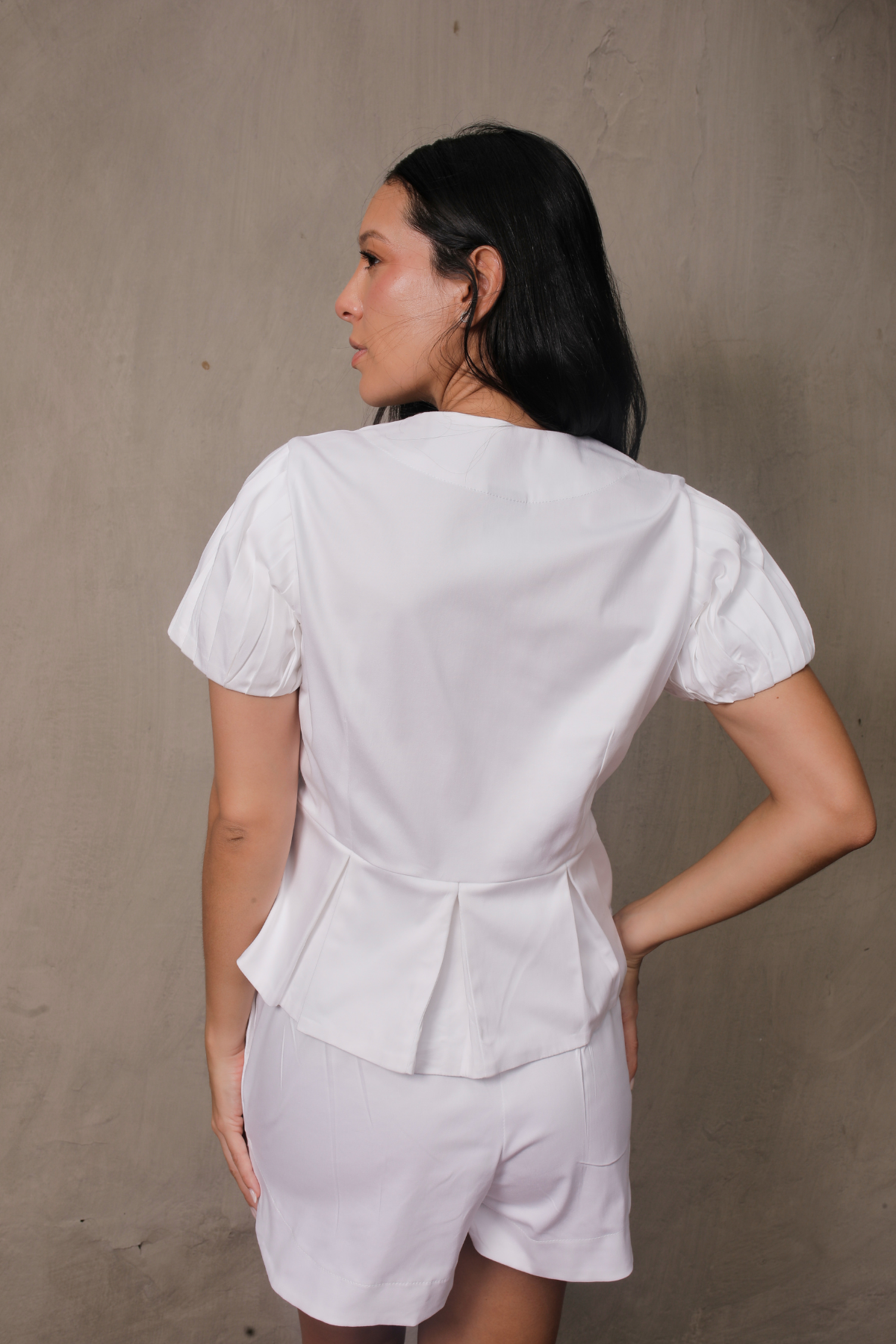 Set de dos piezas confeccionado en drill suave. La blusa cuenta con cuello redondo, botones forrados visibles y mangas con alforzas que aportan estructura, además de un delicado acabado tipo péplum que define la silueta. El short incluye pretina elástica en la parte posterior para mayor confort y bolsillos laterales funcionales. Un conjunto versátil e ideal para un look moderno y casual.