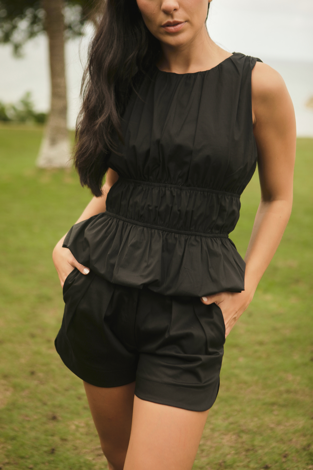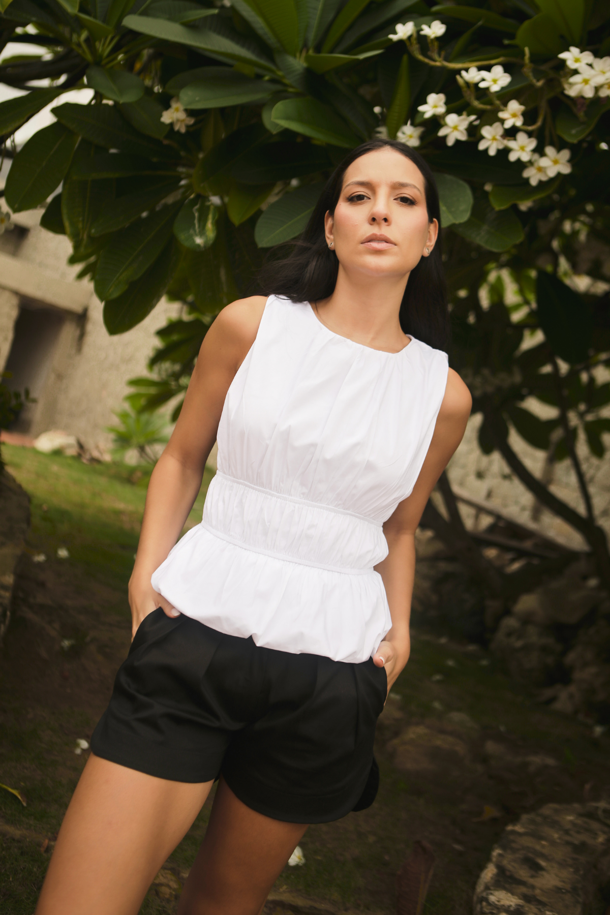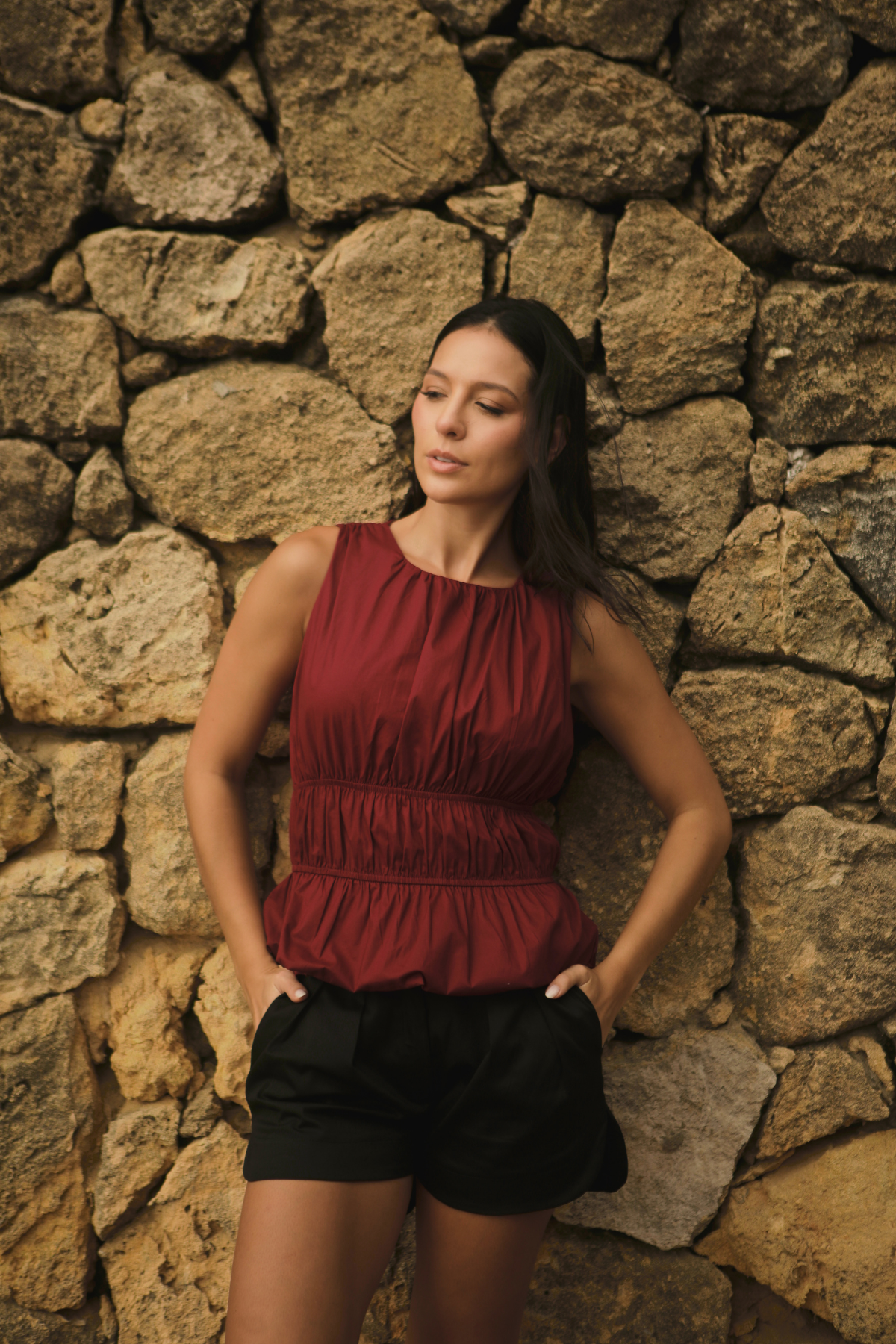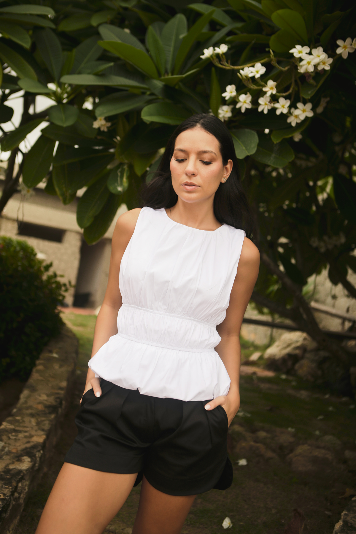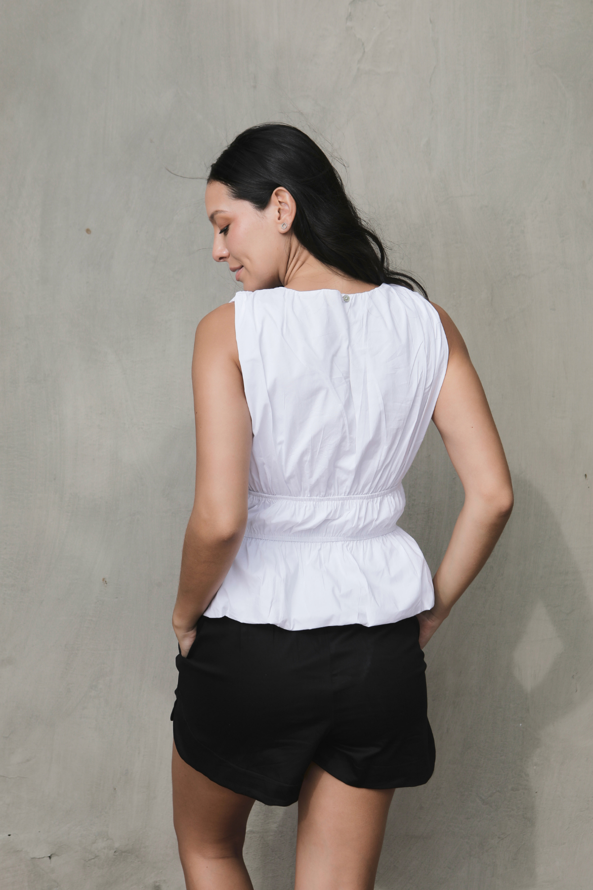 Blusa con sutiles recogidos en el frente y la espalda, que aportan textura y volumen delicado. Confeccionada en algodón popelina, se entalla en la cintura y finaliza en un elegante corte tipo péplum que realza la silueta de forma femenina y sofisticada. Una prenda ligera y versátil, ideal para crear looks pulidos con un aire contemporáneo.